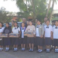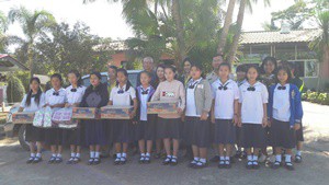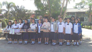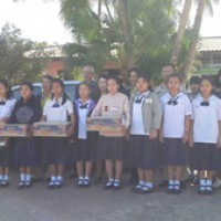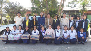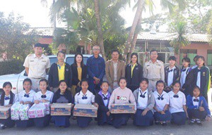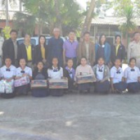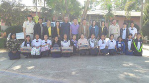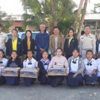 คุณปัญญา ทับทิมแดง ข้าราชการบำนาญ และคณะกรมส่งเสริมสหกรณ์ จังหวัดน่าน มอบของให้กับนักเรียนโรงเรียนชุมชนศิลาแลง