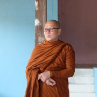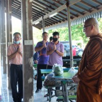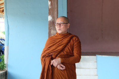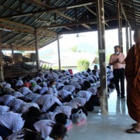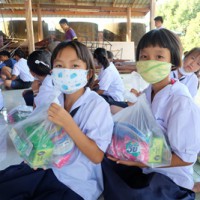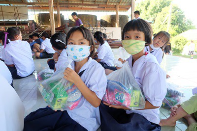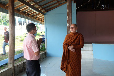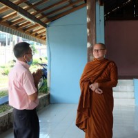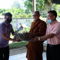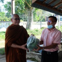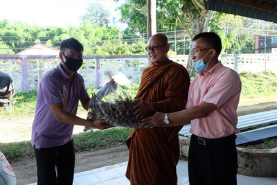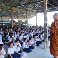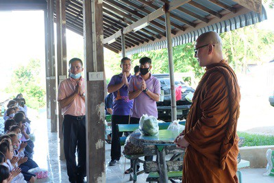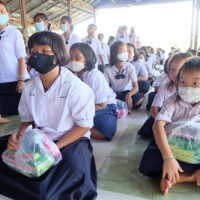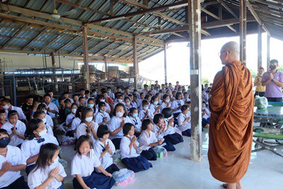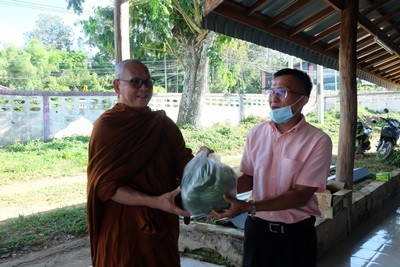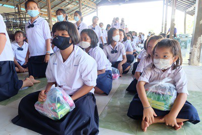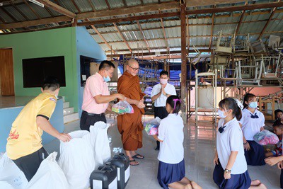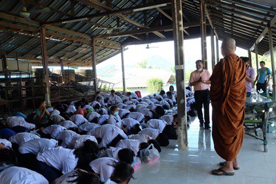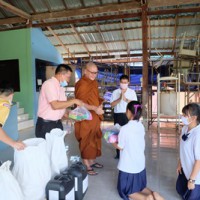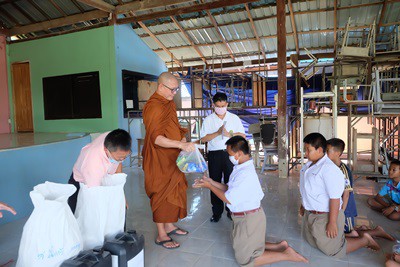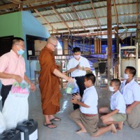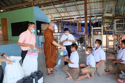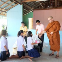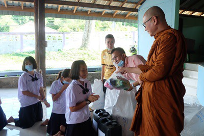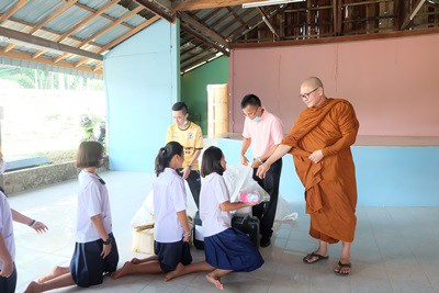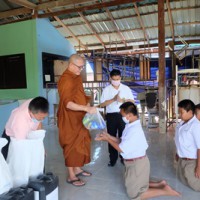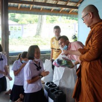 พระทรงพล เขมรังสี วัดเขาตะแบง จังหวัดสุพรรณบุรี มอบของให้กับนักเรียนประจำพักนอนโรงเรียนชุมชนศิลาแลง